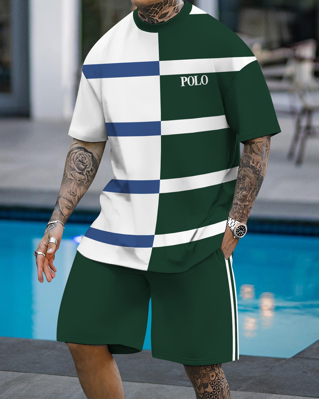 Men's fashion casual color matching printed short-sleeved two-piece set